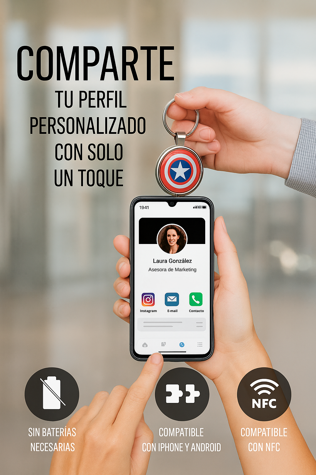 Comparte tu redes sociales al instante. Solo acerca el llavero o escanea el QR y conecta fácil, rápido y sin contacto. Ideal para emprendedores y marcas personales.